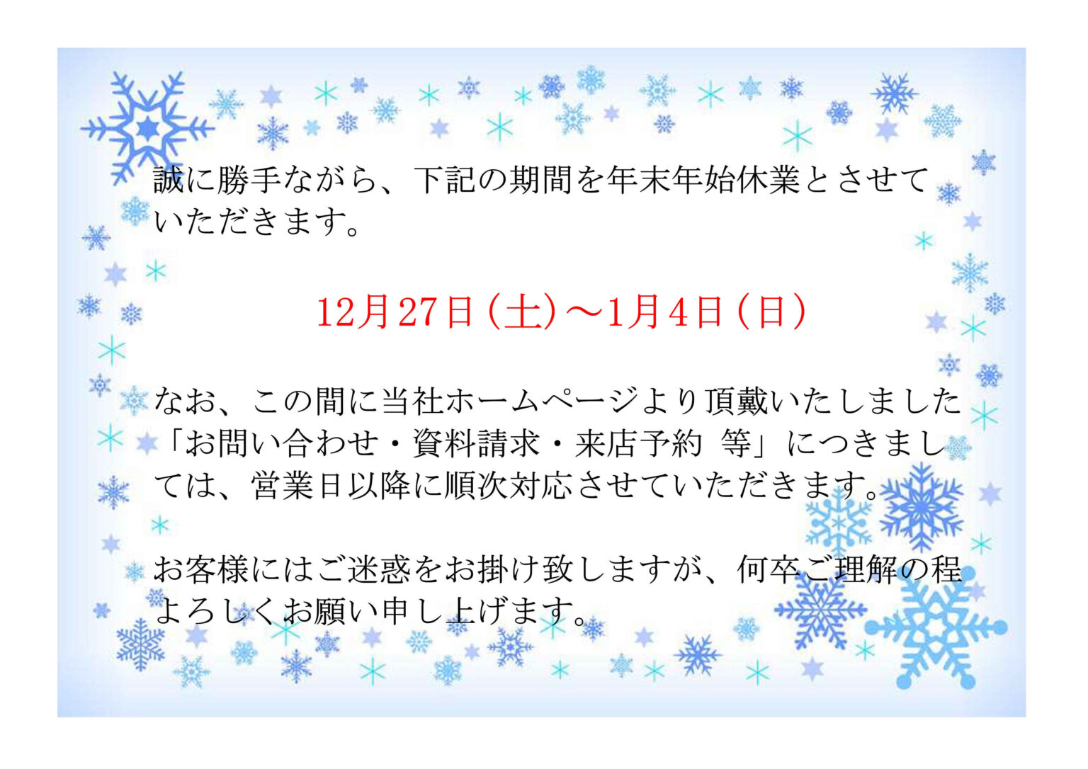 年末年始休業のお知らせ☃️